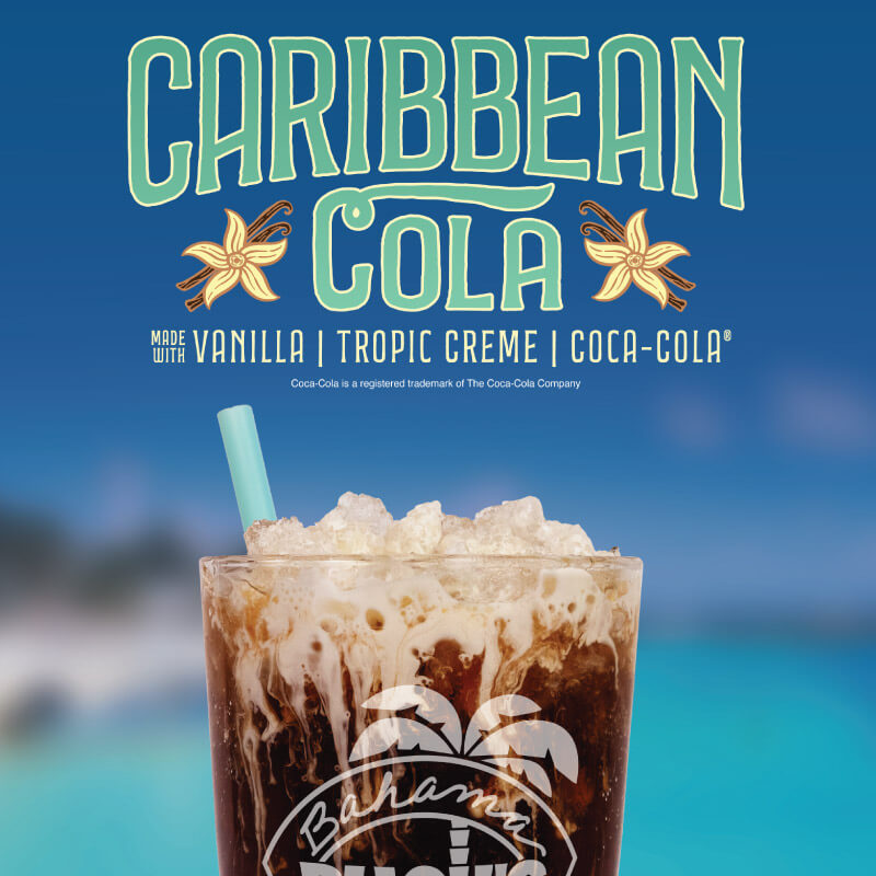 What pairs perfectly with a Beach Bum Sno® or Smoothie? A Caribbean Cola of course! This familiar favorite is a fresh take on the traditional coke float. Featuring Coca Cola® mixed with rich Vanilla flavor & Tropic Creme, this crisp, refreshing drink will make you feel like you’re on island time.